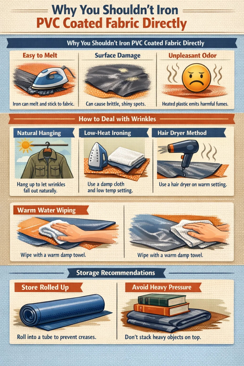Călcare la temperatură scăzută cu o barieră de pânză: Dacă trebuie neapărat să folosiți un fier de călcat, setați-l la cea mai scăzută temperatură. Așezați o cârpă groasă și umedă de bumbac pe spatele țesăturii acoperite cu PVC (partea fără acoperire) ca tampon. Nu lăsați niciodată fierul de călcat să atingă direct materialul și mențineți fierul de călcat în mișcare constantă; nu o lăsa niciodată într-un singur loc.