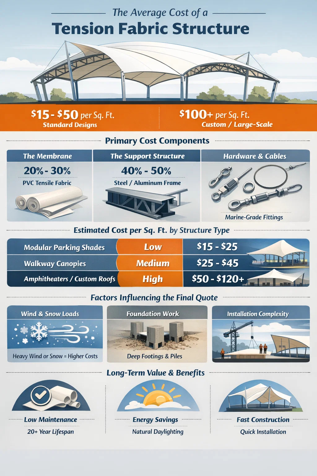 Răspuns direct: Care este costul mediu al unei structuri de țesătură tensionată?
