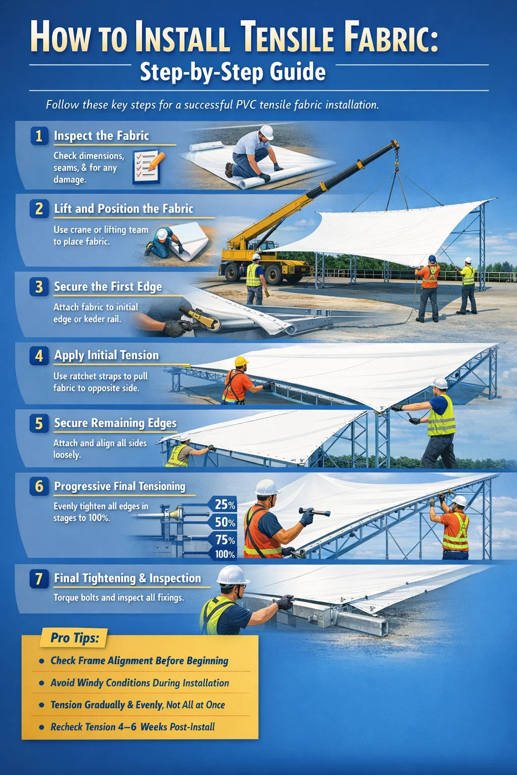 Tensarea completă a unei margini înainte ca celelalte sunt atașate forțează ca singura margine să suporte toată sarcina inițială de pretensionare asimetric. Acest lucru distorsionează geometria țesăturii și creează tensiuni reziduale inegale. Atașați întotdeauna toate marginile liber înainte de a începe tensionarea finală și tensionați întotdeauna în treceri incrementale peste toate marginile.