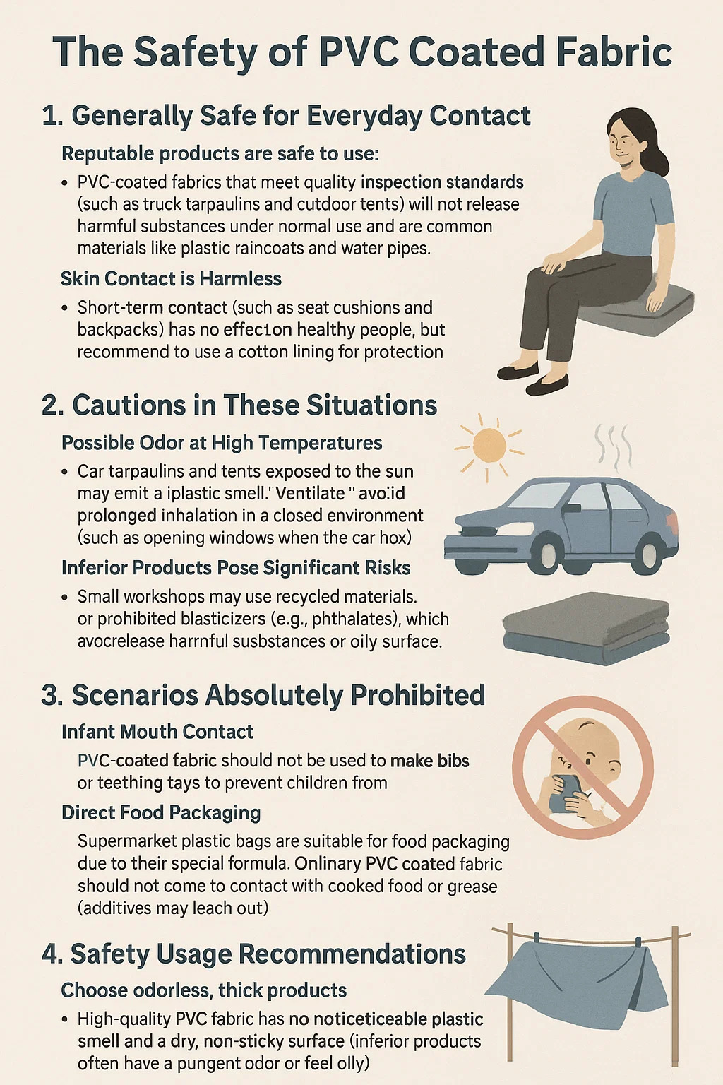 Contactul cu gura sugarului: țesătura acoperită cu PVC nu trebuie folosită pentru a face bavete sau jucării pentru dentiție, pentru a preveni copiii să muște și să ingereze componente chimice.