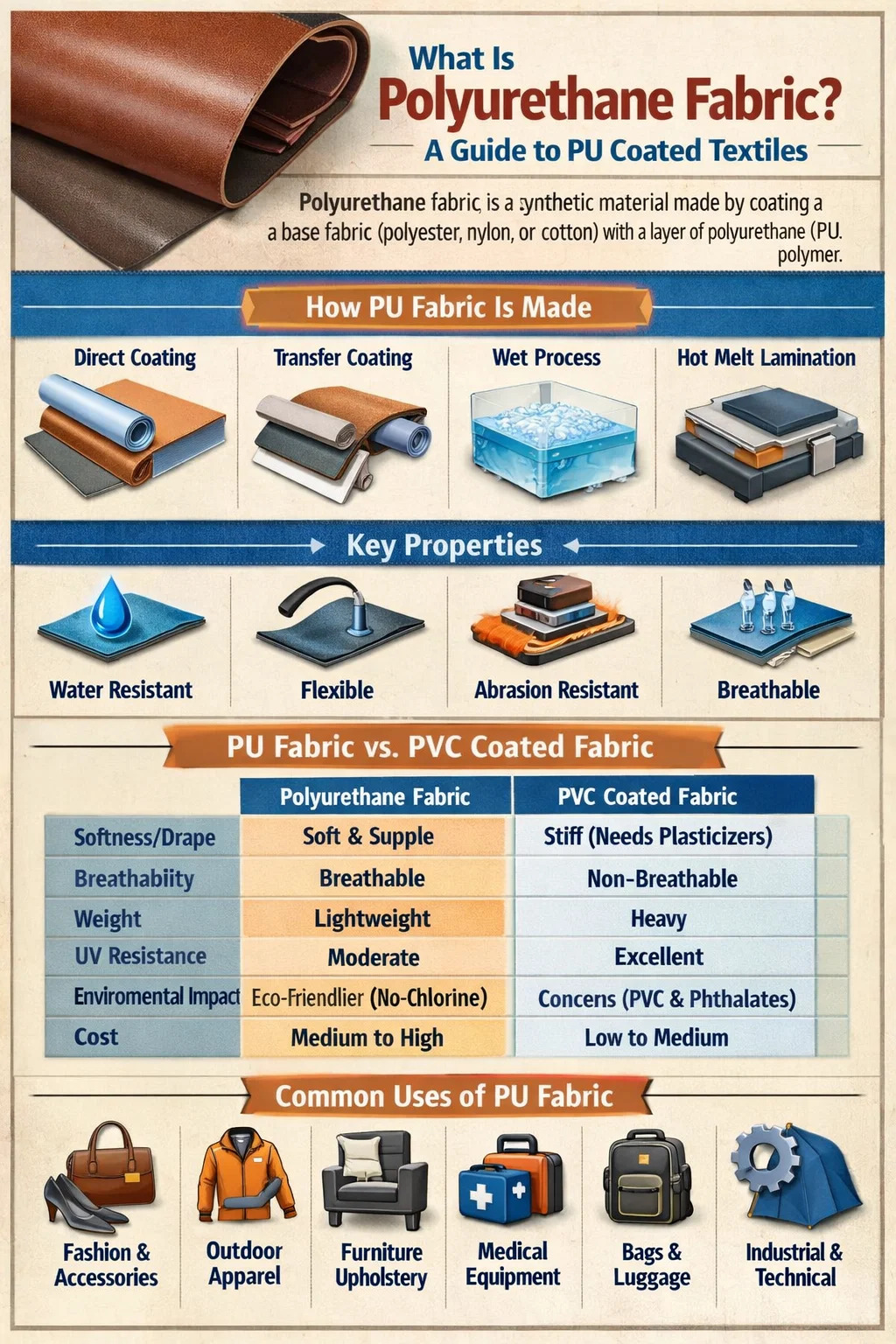 Țesătura poliuretanică este un material textil sintetic realizat prin acoperirea sau laminarea unei țesături de bază - de obicei poliester, nailon sau bumbac - cu un strat de polimer poliuretan (PU). Rezultatul este un material care arată și se simte similar cu pielea sau cauciucul, dar rămâne ușor, flexibil și mult mai accesibil decât alternativele naturale. Este utilizat pe scară largă în modă, tapițerie, îmbrăcăminte sportivă, echipamente pentru exterior, echipamente medicale și aplicații industriale.