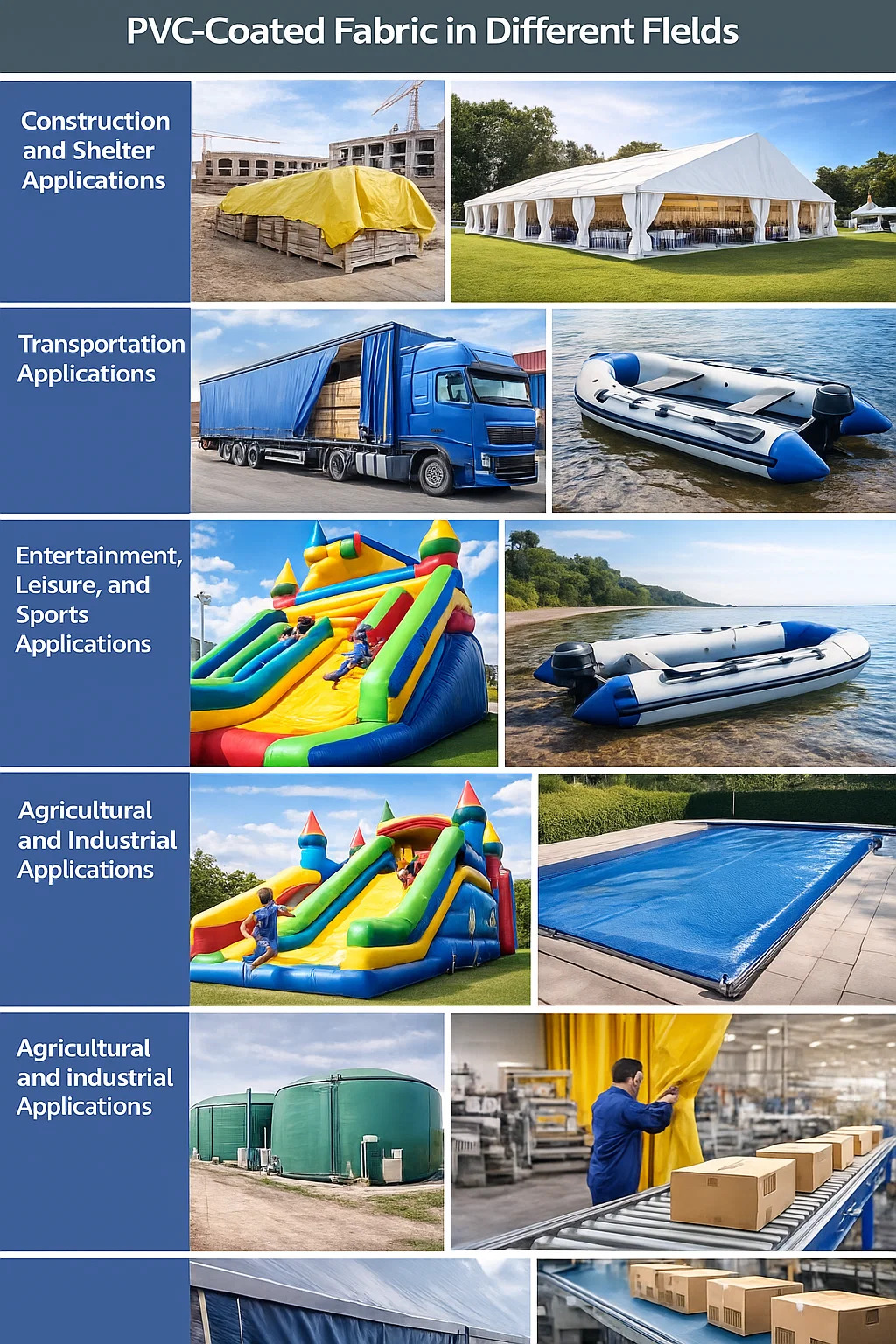 Iată câteva dintre principalele utilizări ale țesăturii acoperite cu PVC în diferite domenii: