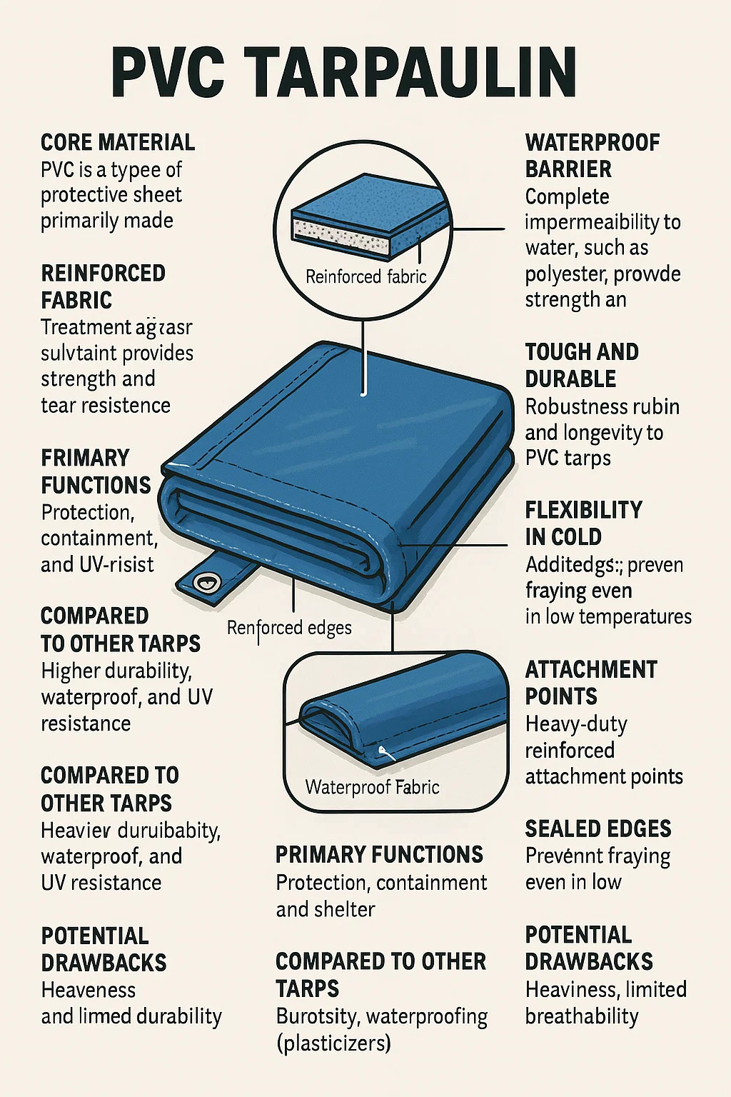•Potențiale dezavantaje: Unele considerente includ faptul că pot fi mai grele decât prelatele din polietilenă, pot avea un miros distinctiv de plastic atunci când sunt noi sau fierbinți și pot fi mai puțin respirabile, potențial prinderea condensului. Opțiunile de reciclare pot fi, de asemenea, limitate.