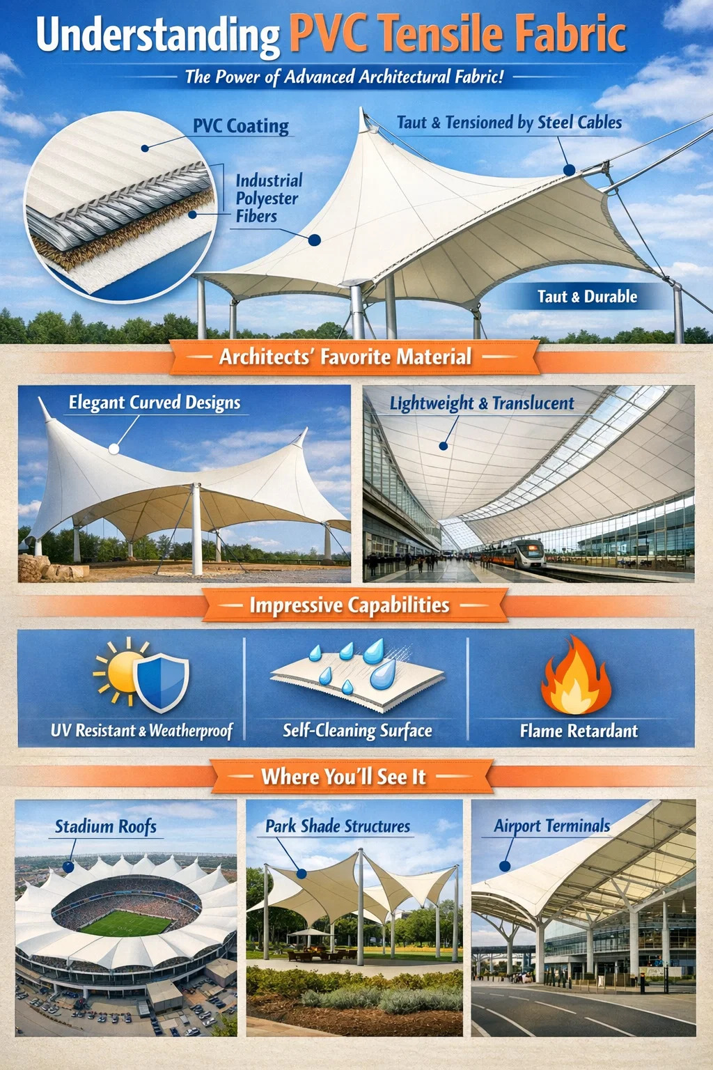 Forme versatile: poate fi întins în forme de șa, forme de cort sau diferite curbe elegante. Veți vedea adesea aceste forme artistice pe stadioane, teatre în aer liber sau structuri de parcare de lux.