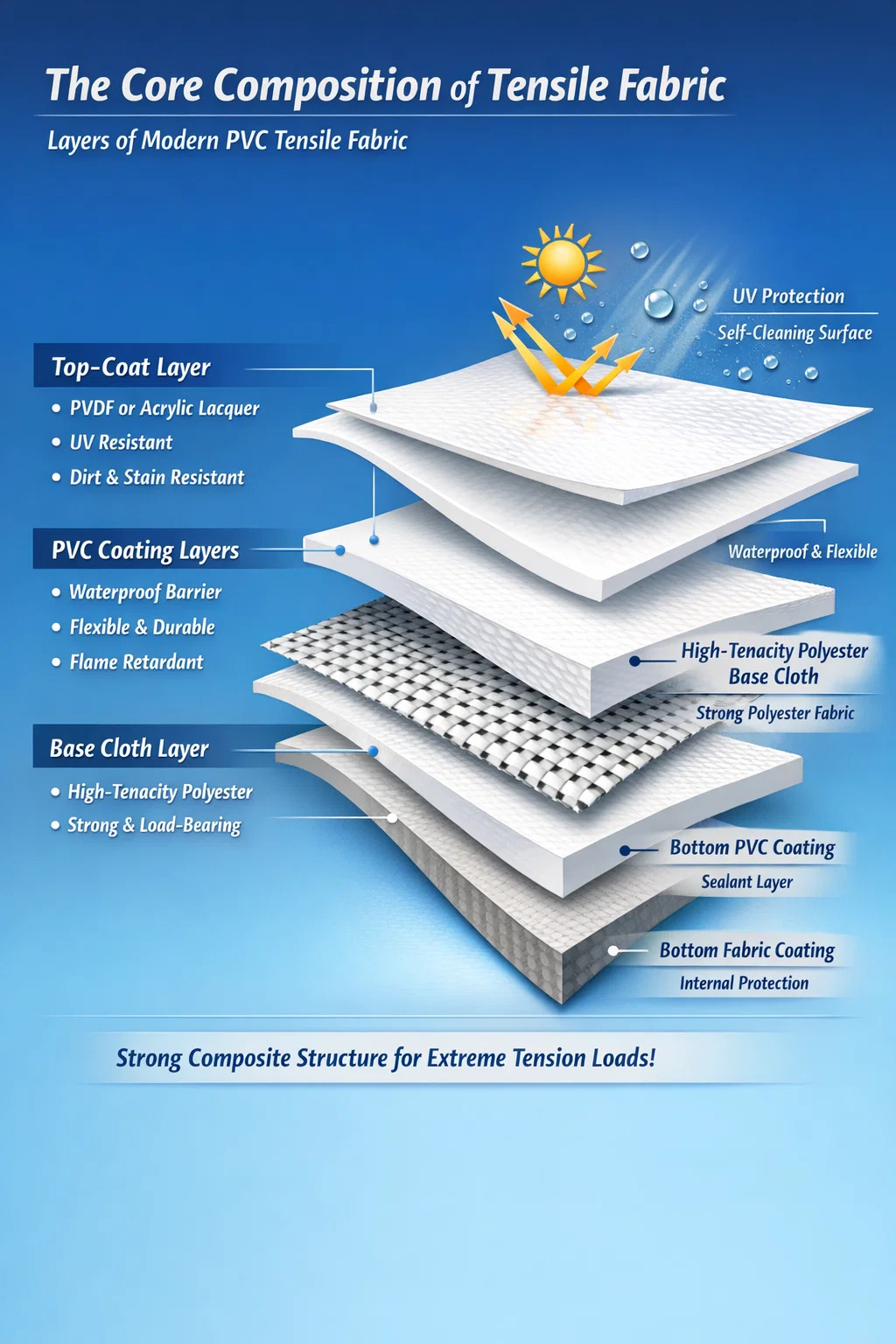 Cele mai moderne Țesătură elastică din PVC este un material compozit sofisticat format din trei straturi primare: a pânză de bază din poliester de înaltă tenacitate , un gros Acoperire cu PVC (clorura de polivinil). , și un specializat lac de top-coat cum ar fi PVDF sau acril. Țesătura interioară oferă rezistența structurală pentru a face față sarcinilor masive de tensiune, în timp ce straturile exterioare de plastic protejează fibrele de degradarea mediului, apă și foc.