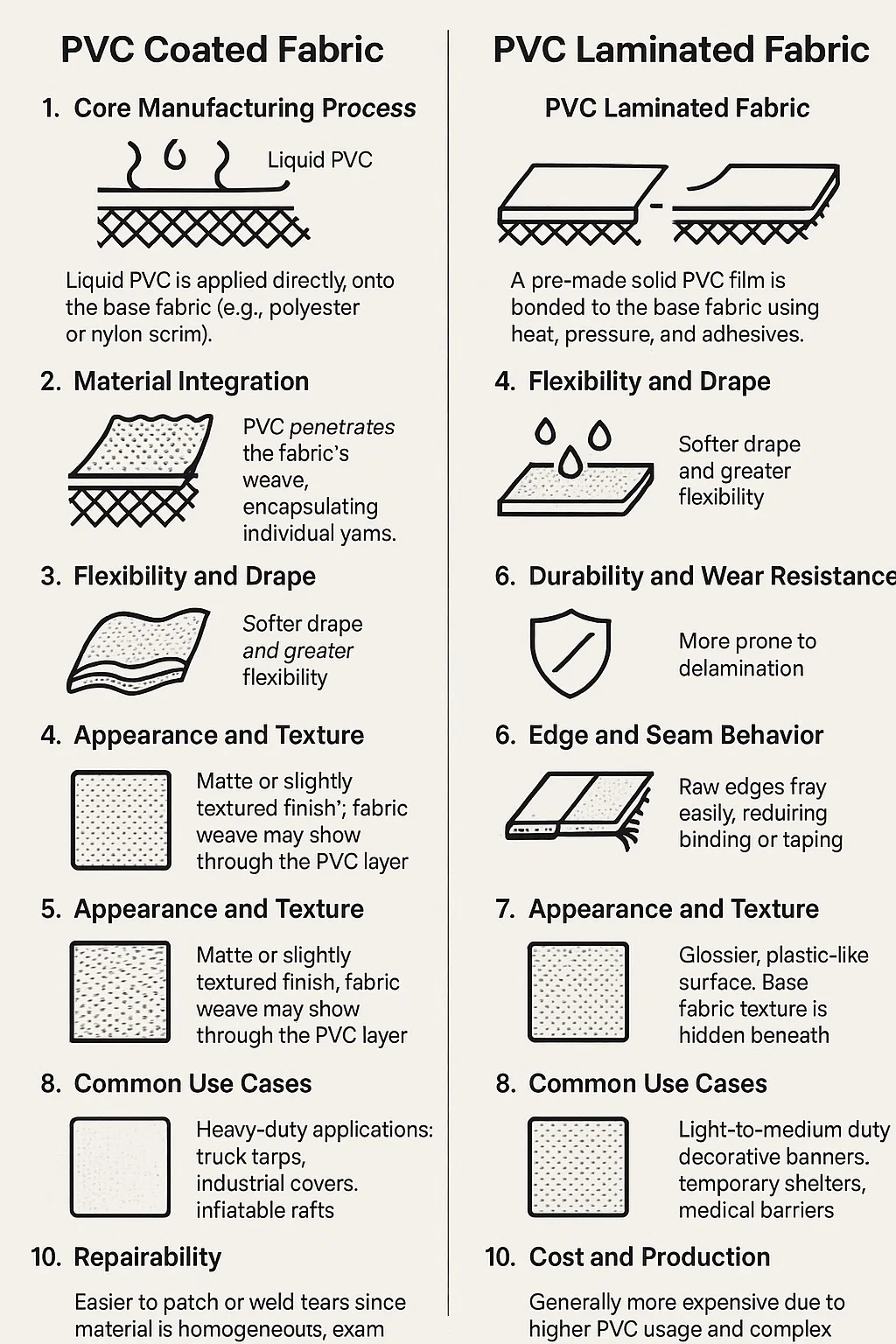 Țesătură laminată cu PVC: Un film din PVC solid prefabricat este lipit de materialul de bază folosind căldură, presiune și adezivi. Țesătura și filmul rămân straturi distincte topite împreună.