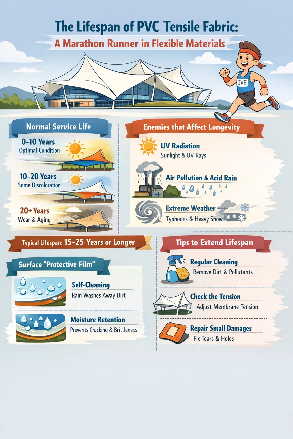 În condiții de întreținere normală, structurile de țesături elastice din PVC de înaltă calitate pot dura de obicei între 15 și 25 de ani sau chiar mai mult.